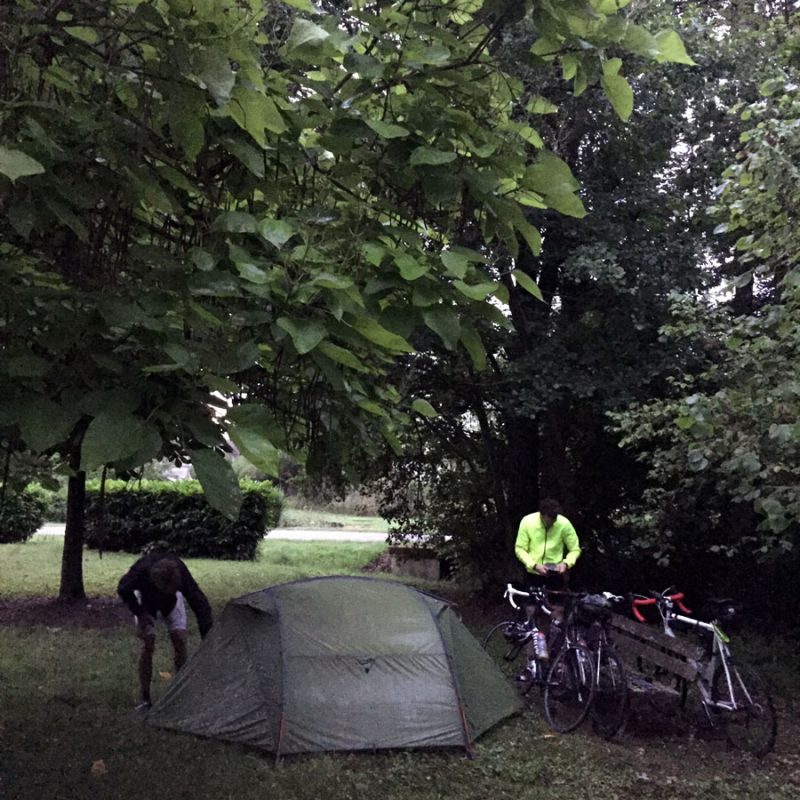 Kurz zu vor hatte es noch mal heftig geregnet, unter einem Baum konnten wir den Regen abwarten. Wir hatten schon Angst mit nassen Kleidern zu schlafen. Doch in der letzten halbe Stunde trocknete alles durch den Fahrtwind. In Nettancourt fanden wir einen öffentlichen Campingplatz. Dort bauten wir unser Zelt direkt neben einem Bach auf. Wir waren richtig erschöpft und stolz die 250km Marke geknackt zu haben.