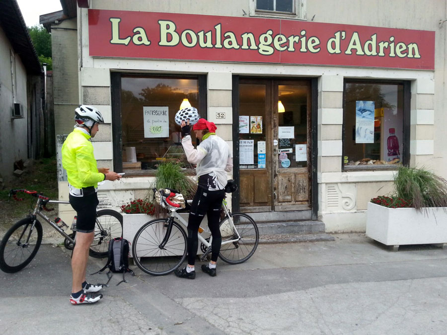 Nur mühsam ging es den Berg hinauf. In Saint Mihiel stoppten wir bei einem Supermarkt, um ca. 1,5kg Taboulé zu kaufen. In der Sonne vor einer schönen Kathedrale gab es unser Abendessen. Wir hatten noch weniger als 250km auf dem Tacho, als wir unser Abendessen verzerrten. Wir wollten noch unbedingt über 40 weitere Kilometer fahren, damit wir am Sonntagabend Paris erreichen konnten. Nach dem Abendessen war es windstill und auf ein Mal war es auch nicht mehr so hügelig. Dies bescherte uns einen guten Schnitt und wir kamen flott voran. Auf ein Mal fühlten wir uns alle stark und voller Energie. Als wir 250km und über 2.400hm gefahren hatten, suchten wir einen Schlafplatz.