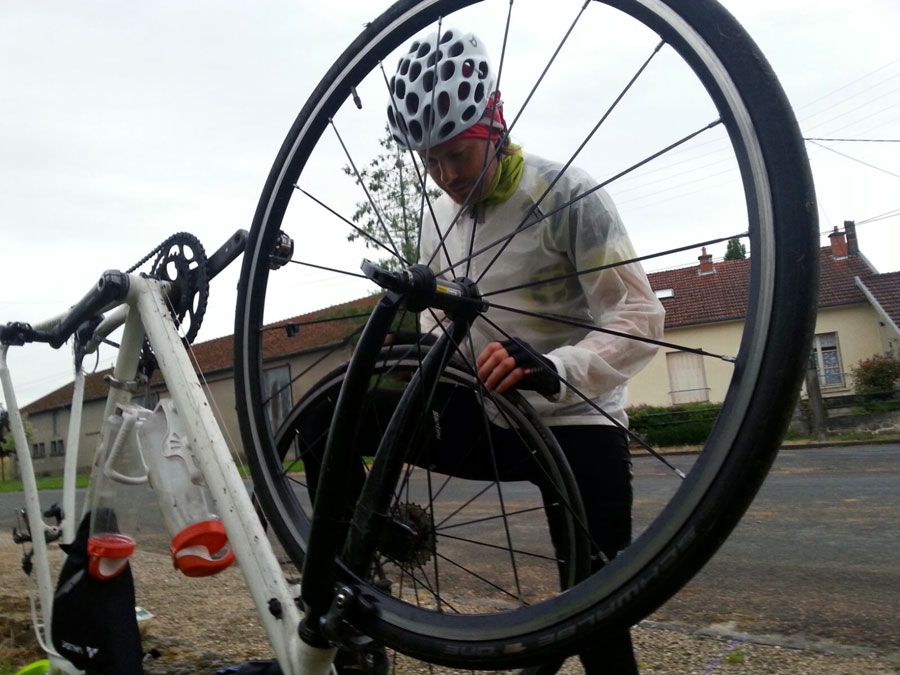 André und Norman waren schon außer Sichtweite und ich lief einige Meter an der Straße entlang. Bei jedem Auto was vorbeifuhr streckte ich meinen Daumen nach außen, weil nur André eine Luftpumpe dabei hatte. Jeder von uns hatte einen Ersatzschlauch zur Not dabei, Reifenheber, Minipumpen und Werkzeug teilten wir uns als Gruppe. Der Fahrer von einem kleinem weißen Van hielt an und nahm mich für 2-3 km mit, um so schnell wie möglich zu André und Norman zu kommen. Diese hatten erst spät mein Fehlen bemerkt und waren schon auf dem Rückweg, als ich in den kleinen Van mein Fahrrad verstaute. Der Fahrer konnte nur Französisch, aus diesem Grund haben wir uns mit Zeichensprache verständigt. Zwei Täler weiter traf ich schon auf den Rest vom Team. An der Seite der Straße konnten wir meinen Schlauch wechseln. Mein Mantel hatte einen Schnitt von ca. 5mm, dieser befand sich direkt in der Mitte vom Mantel. Wir legten nichts drunter, um den Mantel zu stabilisieren, trotzdem hat es gut funktioniert: „Herr Wolbold hätte sich einen 5 Euro Schein eingespannt“. Für das Mittagessen hielten wir bei einem Supermarkt. Es gab Käse und Baguette in Champenoux um ca. 13:00h. Endlich wurde es heller und wärmer. In der Sonne genossen wir die Stärkung, während wir die nassen Kleider trocknen konnten. Am Nachmittag ging es deutlich schneller voran, obwohl es weiterhin sehr windig war. Erst am Spätnachmittag waren wirklich stark erschöpft. Wir hatten zuerst geplant am heutigen Tag ca. 300km zu fahren. Der starke Regen, der ständige Gegenwind und die endlosen Hügelketten reduzierten unsere Tagesleistung enorm. Bei Kilometer 180 waren wir am Tiefpunkt unserer Reise. Die Energie war weg und wir mussten unser Tagesziel deutlich reduzieren. Vor einem großen, langem Anstieg machten wir eine lange Pause und haben unsere Beine hochgelegt und ein wenig relaxed, um Kraft für den nächsten Abschnitt zu bekommen.