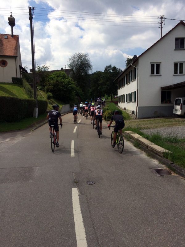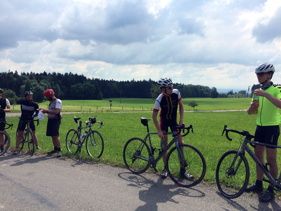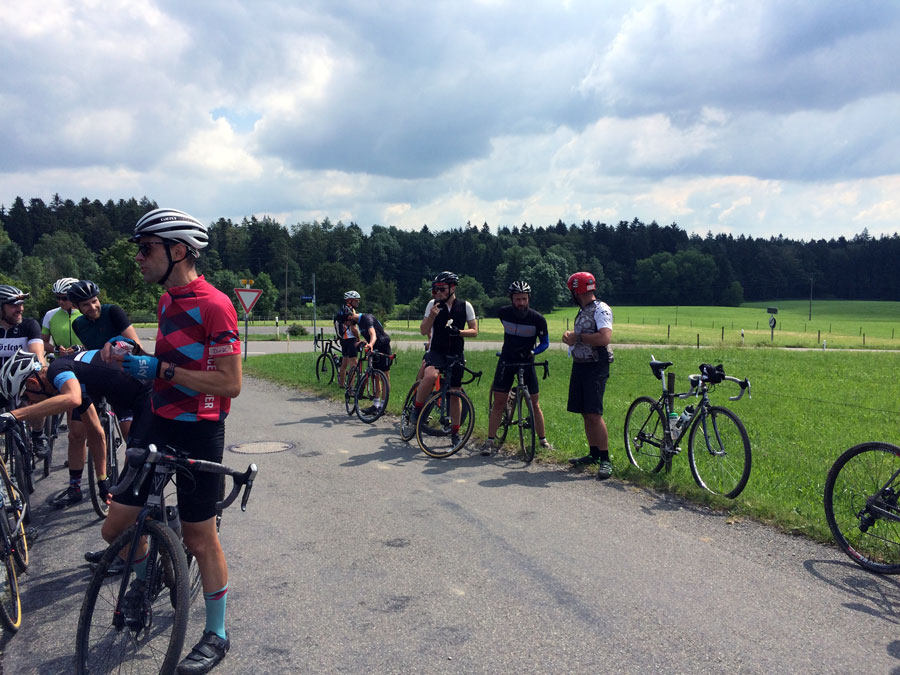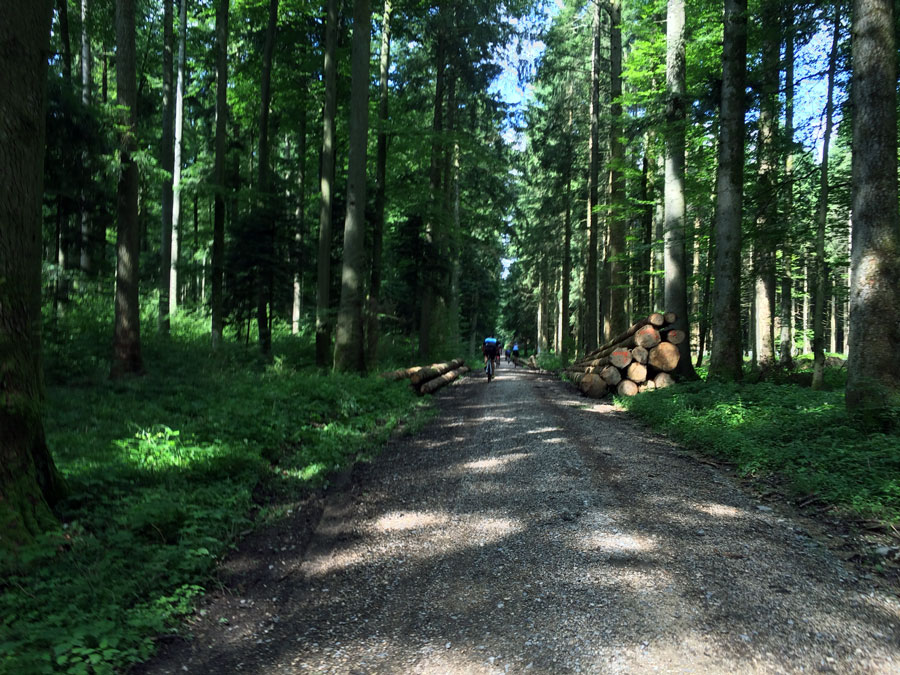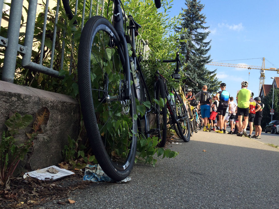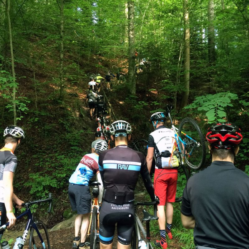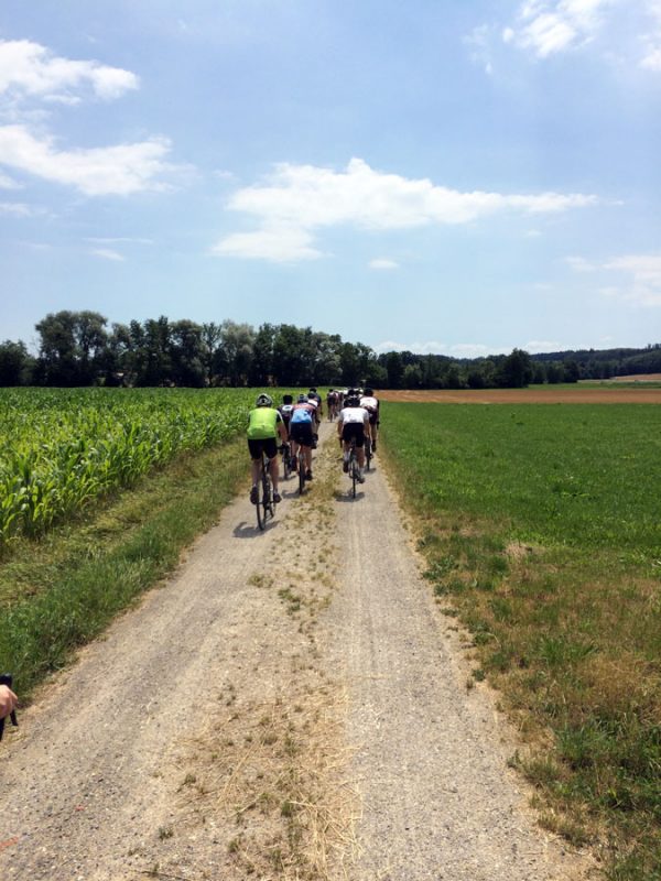 Die letzten 35 Kilometer zurück nach Ravensburg leitete Sören mit den Worten „Es hat sich herausgestellt, das am Ende immer ein Ausscheidungsrennen gefahren wird“ ein. Dem blieb nichts hinzufügen und so löste sich das Gruppetto langsam auf. Wer noch konnte, folgte der Spitze und andere (so wie wir) ließen es langsamer angehen. Kurz vor Schluss wartete noch ein besonderes Highlight: Der berüchtigte Wald von Ravensburg. Er ist vielleicht nicht so bekannt, wie sein Namensvetter und Vorbild der Trouée d’Arenberg, aber genauso materialintensiv. Dieses Teilstück ist mit ca 5cm großen, manchmal spitzen Steinen „geschottert“ und der natürliche Feind von Mantel und Schlauch. So kämpften wir uns also durch das Segment und fuhren im Anschluss an mehreren Fahrern vorbei, die den Schlauch wechseln mussten.
