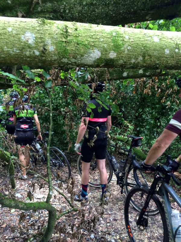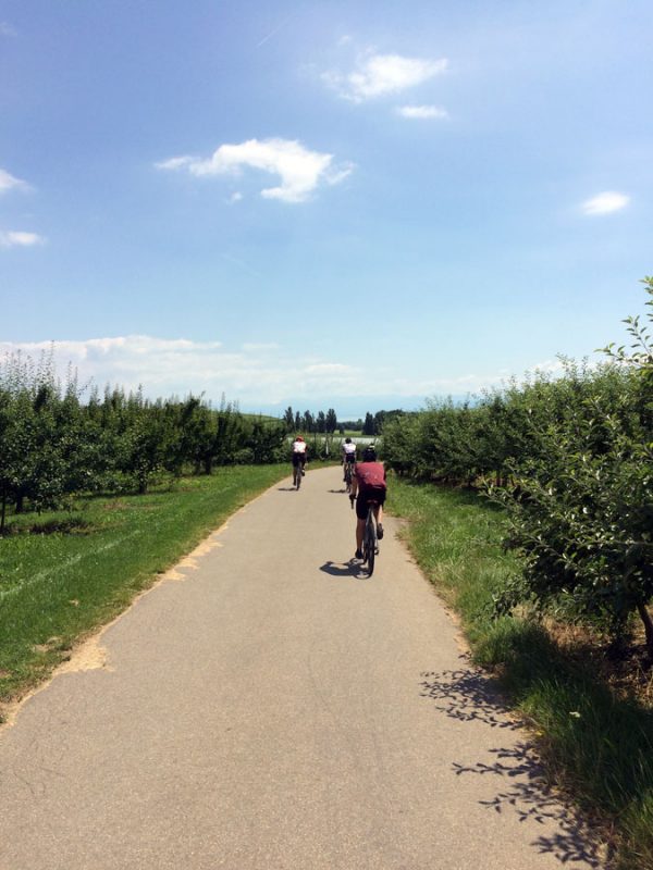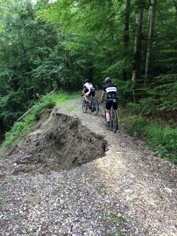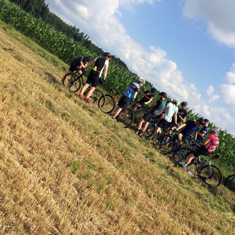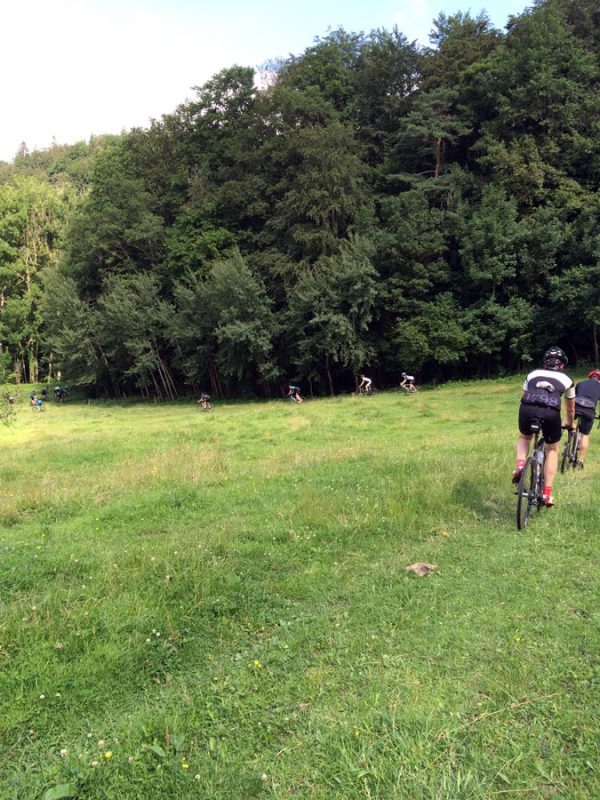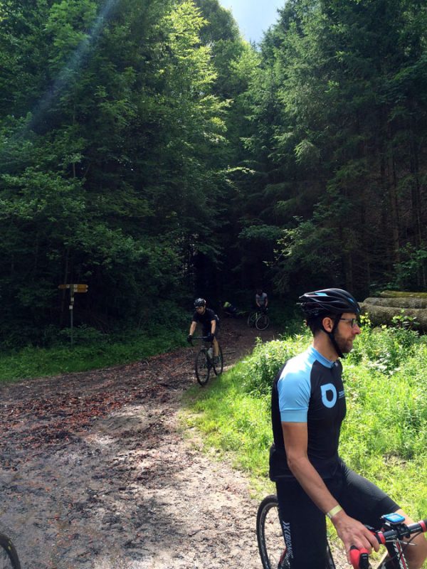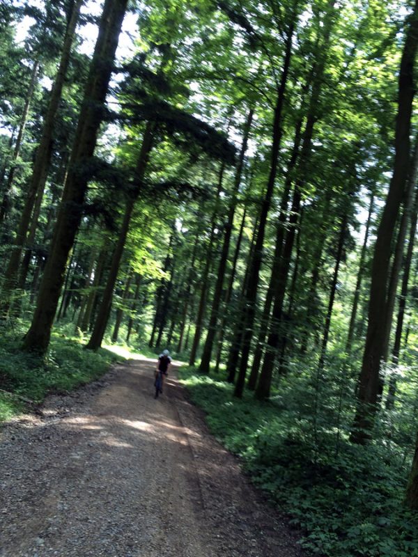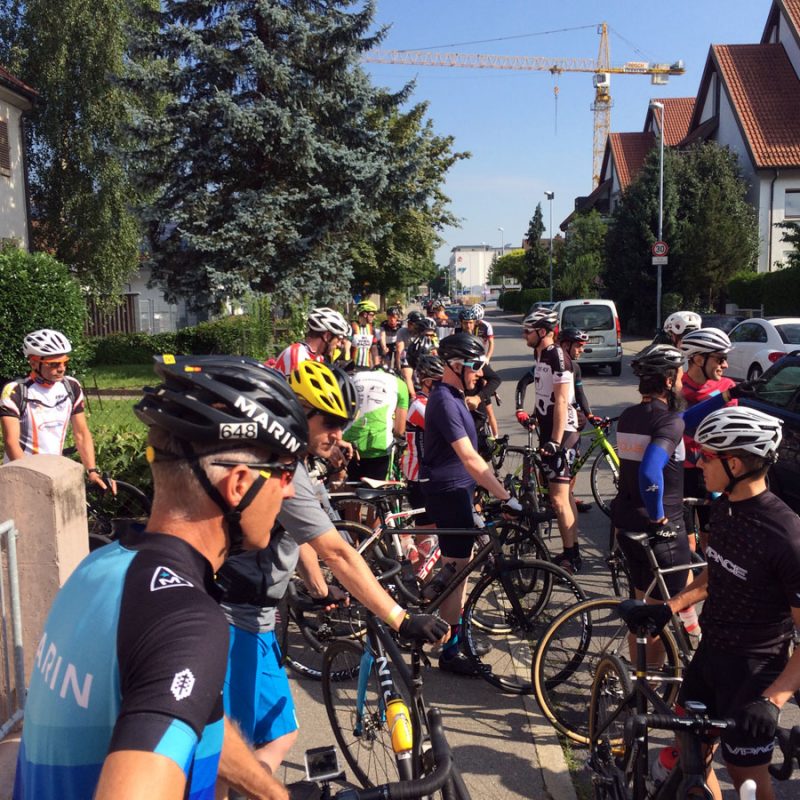 Die letzten 35 Kilometer zurück nach Ravensburg leitete Sören mit den Worten „Es hat sich herausgestellt, das am Ende immer ein Ausscheidungsrennen gefahren wird“ ein. Dem blieb nichts hinzufügen und so löste sich das Gruppetto langsam auf. Wer noch konnte, folgte der Spitze und andere (so wie wir) ließen es langsamer angehen. Kurz vor Schluss wartete noch ein besonderes Highlight: Der berüchtigte Wald von Ravensburg. Er ist vielleicht nicht so bekannt, wie sein Namensvetter und Vorbild der Trouée d’Arenberg, aber genauso materialintensiv. Dieses Teilstück ist mit ca 5cm großen, manchmal spitzen Steinen „geschottert“ und der natürliche Feind von Mantel und Schlauch. So kämpften wir uns also durch das Segment und fuhren im Anschluss an mehreren Fahrern vorbei, die den Schlauch wechseln mussten.