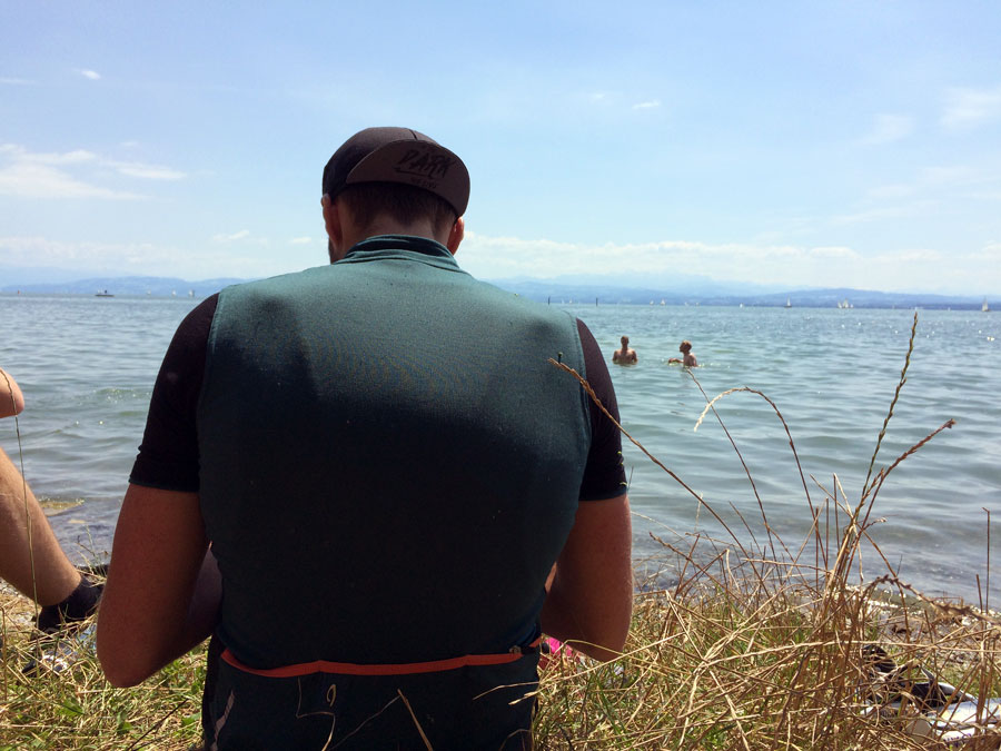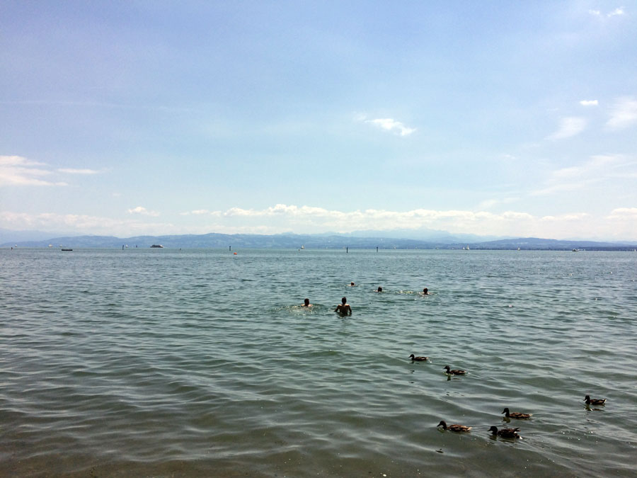 Am Bodensee angekommen, wurden wir mit Bananen, Äpfeln, Erdnüssen und weiteren Getränken von Sörens Vater empfangen. Da die Sonne zwischen den Wolken herausschaute, bot der Bodensee eine willkommene Erfrischung für einige Giroteilnehmer.