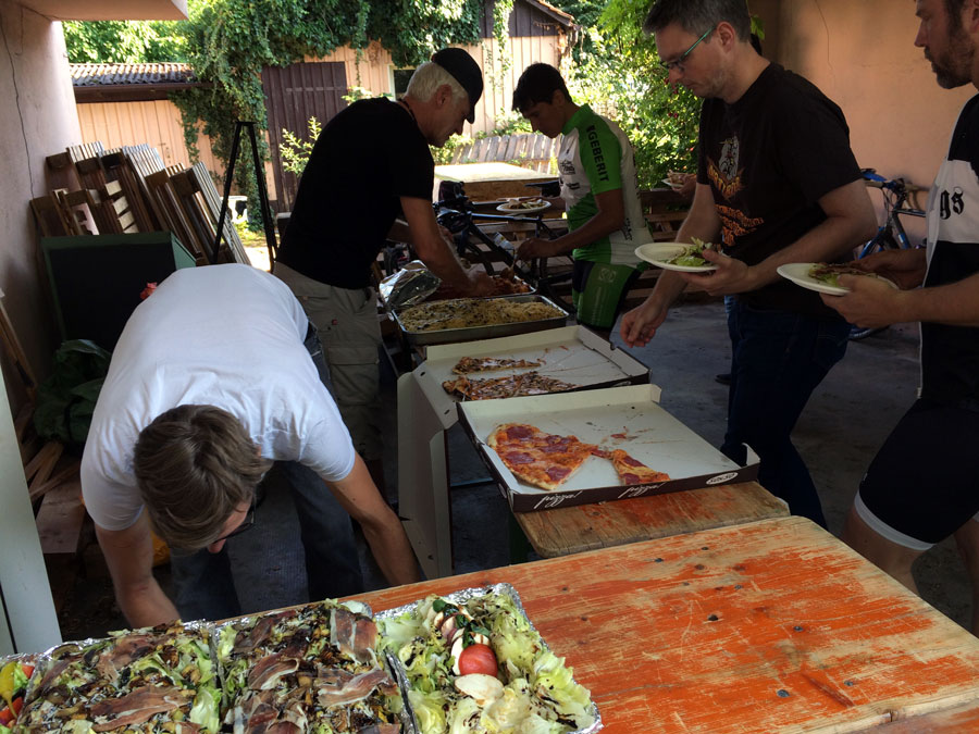 Zurück in Ravensburg gab es die Möglichkeit zu duschen und sich frisch zu machen, bevor die Tour bei Pizza, Pasta und Bier im Hof des VPACE-Showrooms ihren Ausklang fand.
