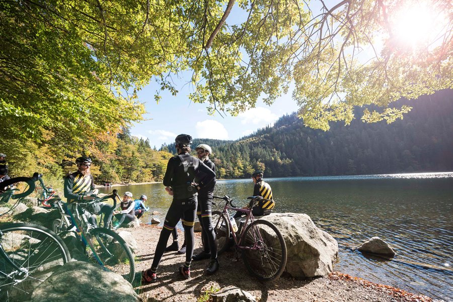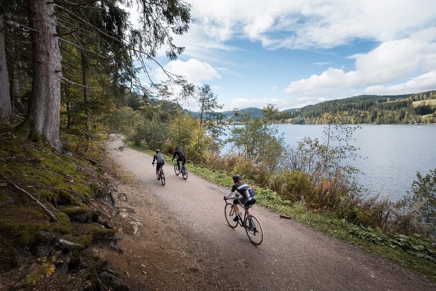Gleich zu Beginn ging es die letzte Abfahrt des gestrigen Tages hinauf, wieder zum Feldberg. Anschließend folgte eine lange und wunderschöne Abfahrt zum Schluchsee. Dort war die erste Verpflegungspause geplant. Bei strahlendem Sonnenschein gab es am Seeufer Kaffee vom Biosk-VW-Bus und dazu erneut Schwarzwälder-Kirsch und Apfelkuchen. Genau so sollte ein Sonntagvormittag ablaufen. Nach einer halben Umrundung des Schluchsees ging die Strecke sanft einen Berghang hinauf zum schönsten Strava-Segment des Tages, zur Rosshütte.