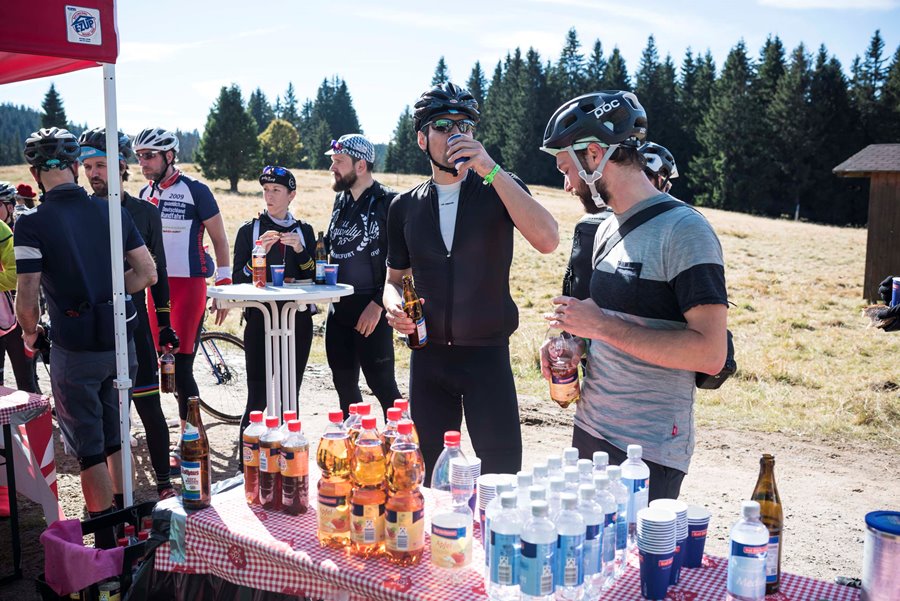 An der ersten Verpflegungsstelle, die eigentlich die zweite des Tages war (die erste ist im Nebel am Feldberg untergegangen), gab es Bananen und technischen Support von Sram. Jetzt kam endlich auch die Sonne durch und wärmte die mittlerweile schon nahezu leeren Beine. Bei Kilometer 50 bogen wir zur Skisprungschanze Adlerschanze ein und wurden mit der nächsten Verpflegungsstation belohnt. Hier haben sich die Veranstalter ein besonderes Schmankerl ausgedacht und reichten Brote mit Schwarzwälder Schinken oder Bergkäse und dazu ein alkoholfreies Hefeweizen. Ein wunderbarer Kontrast zu den immergleichen Verpflegungspunkten anderer Radveranstaltungen.