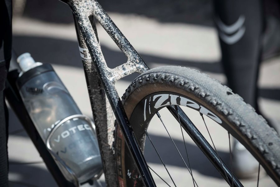 Und das Rad war wirklich vom Allerfeinsten! Aufmontiert auf den VOTEC VRX-Aluminium-Rahmen waren top Komponenten. SRAM Rival 1×11 Schaltung mit 10-42 (!!!) Kassette und hydraulischer Scheibenbremse, ZIPP 30 Course Wheelset mit den neuen Schwalbe G-One Gravel-Reifen und der Ergon SRX30 Sattel.
