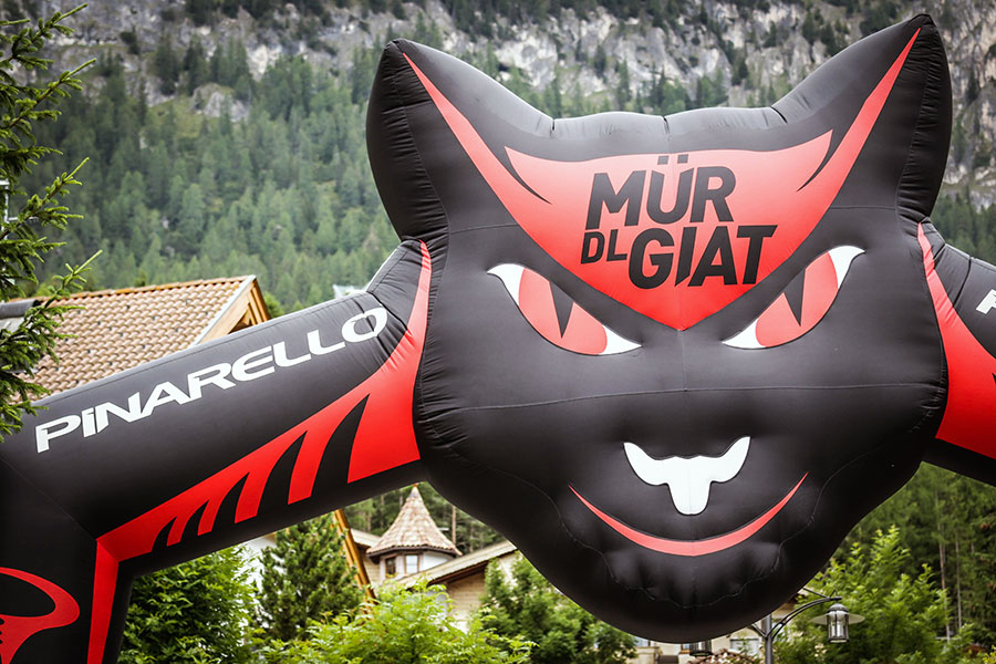 Die Sache hat nur einen kleinen Haken. Wir haben unser Maratona-Erlebnis hinter uns, aber es ist gerade mal 10 Uhr morgens. Wir nutzen die verbleibende Zeit und begeben uns an den Fuß der „Mür dl Giat“. Die 360 Meter lange und 19%-steile Katzenmauer bildet für die längeren beiden Strecken die letzte Hürde vor dem Ziel in Corvara. Hier herrscht richtig gute Stimmung und die Menschen an der Seite peitschen die Athleten mit Kuhglocken die Rampe hoch. Wer kurz vor der Erschöpfung ist, wird auch mal von zupackenden Händen auch mal hochgeschoben. An der Mür zeigt sich was dieses Event zu etwas ganz Besonderem macht. Trotz der Strapazen der letzten Stunden wird hier nochmals alles reingeworfen. Nach der Katzenmauer kann man mit einem Grinsen im Gesicht auf den letzten Kilometer gehen und weiß, das man den Mythos Maratona gemeistert hat.