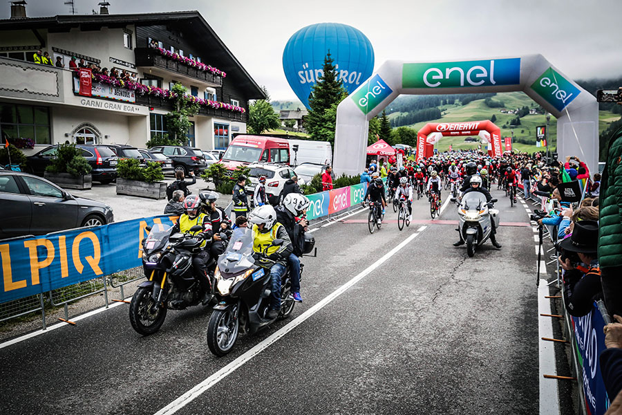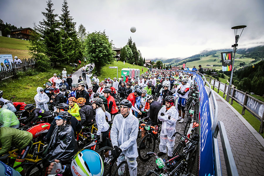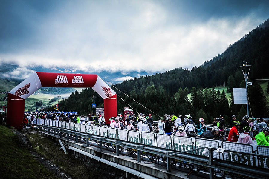 Wir treffen uns wie am Vortag ausgemacht um 6.00 Uhr vor dem Hotel, um zum Start in Alta Badia zu fahren. Da es nur den Berg hinabgeht, kommen wir entspannt an. Nur die 4°C bekommen wir direkt auf der ersten Abfahrt Richtung Start zu spüren. Das wird eine kalte erste Hälfte des Rennens. Wir dürfen aus dem ersten Startblock starten und haben das Glück an all den anderen Startern vorbeizurollen, die sich bereits in ihren Startbereichen eingefunden haben.