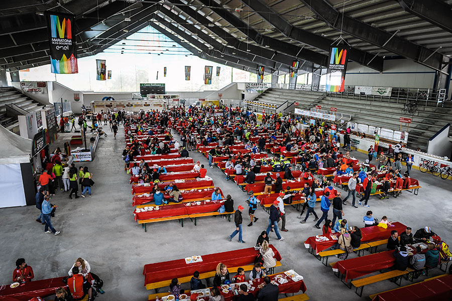 Die Maratona beginnt für alle Teilnehmer sämtlicher Strecken genau gleich, sodass man unterwegs je nach Tagesform die Streckenlänge variieren kann. Zunächst steht der Passo Campolongo zum Warmrollen an. Es müssen 5,8km mit durchschnittlich 6,1% Steigung bewältigt werden. Die ersten Kehren sind noch im Ort und mit Menschen am Straßenrand gesäumt. Die Stimmung wird den ganzen Tag über großartig sein. Gefühlt sind alle Einwohner der Region auf den Beinen, um uns Fahrer anzufeuern. Nach der ersten kalten Abfahrt nach Arabba folgen der Passo Pordoi (9,2km bei 6,9%), der Passo Sella (5,5km bei 7,9%) und der Passo Gardena (5,8km bei 4,3%). Alle vier Anstiege bilden zusammen die bekannte „Sella-Ronda“, die zu den bekanntesten Rennradtouren der Alpen zählt. Kein Wunder, denn alle Berge sind sehr rhythmisch zu fahren und bei der Umrundung des Sellastocks ergeben sich wunderbare Panoramen.